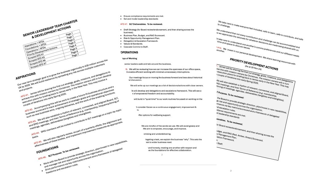 “What is it for us to lead fully within our delegated freedoms to create the space for the collective work needed to grow the business to £30m by 2027? What behaviours and ways of working must we let go off, hold on to, and put in place inside the next 3 months? How will we hold ourselves accountable for this much needed step-change in leadership effectiveness?”