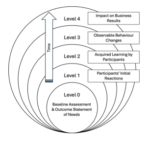 The Kirkpatrick Method provides a structured, multi-level framework for evaluating the effectiveness of a team development programme. Its strength lies in linking immediate learning experiences to longer-term behavioural change and organisational impact. This framework is captured as Level 0 – Level 4 below.